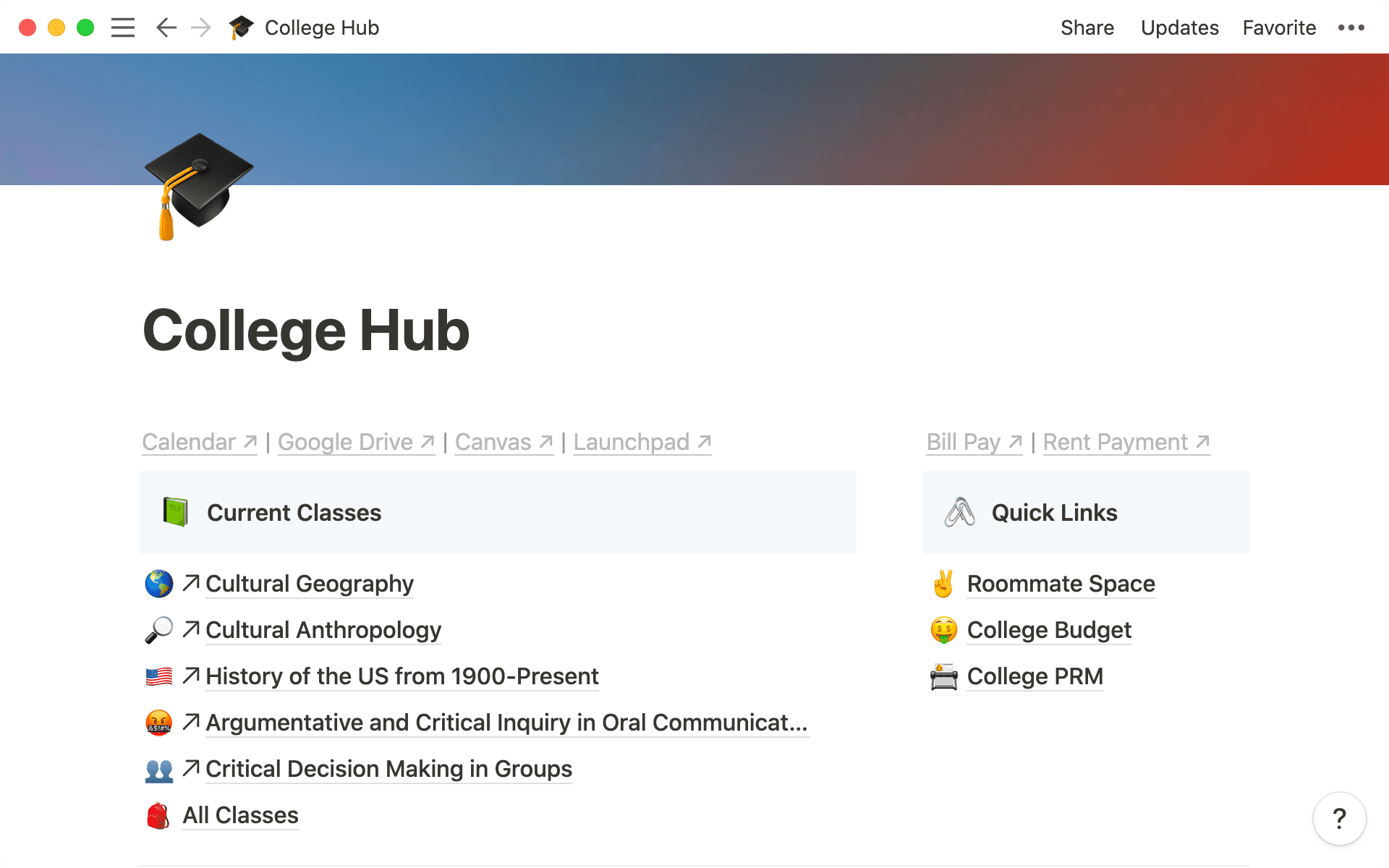 If you're a busy college student looking for a one-and-done dashboard, this is it. All parts of your life live side-by-side — but each has its own designated section you can customize. Assignments live in a database so you’ll never miss a deadline. Track your personal budget and expenses. Keep your roommates accountable with the shared roommate space. No excuses!