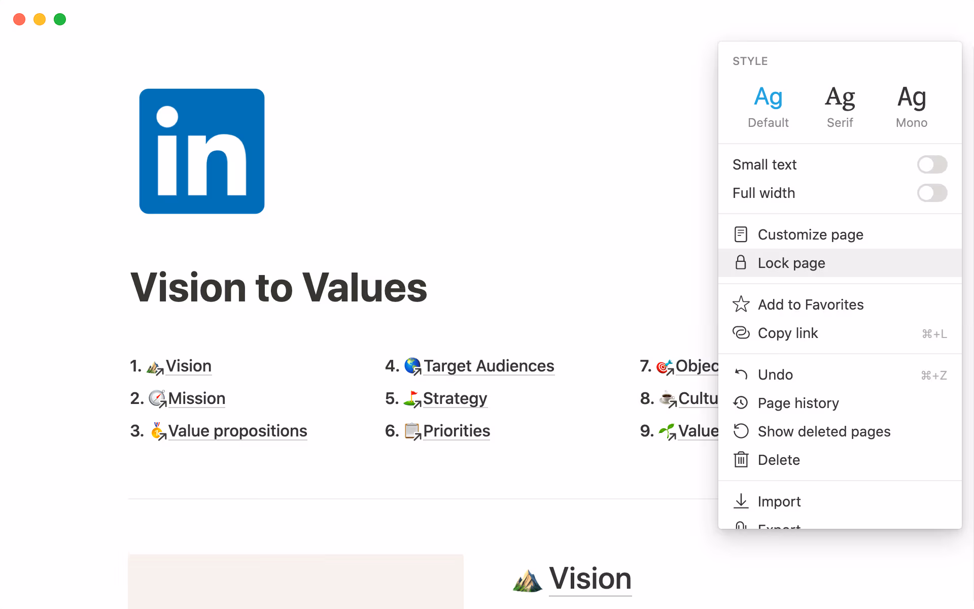 Your Vision to Values one-pager should be visible to everyone in the company, but you also don't want people to delete anything important. To avoid this, you can lock the page so that everyone can access it without accidentally editing it. You can also share the page with certain people and set read-only permissions.